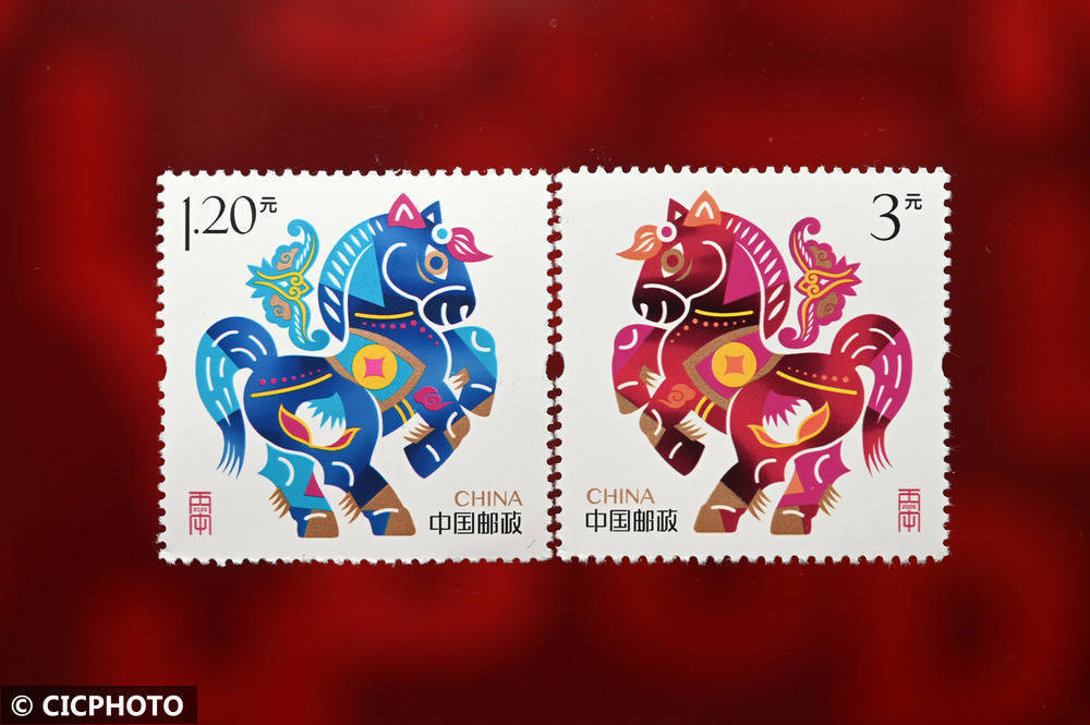 ↑2025年11月18日在中国邮政集团有限公司四川省内江市东兴区分公司拍摄的《跃马添福》《鸿运驰春》贺年专用邮票。CICPHOTO/兰自涛 摄