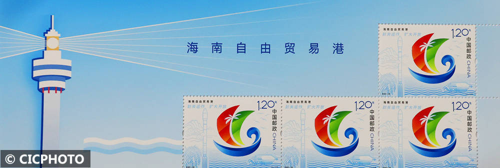 ↑2025年12月18日在江苏省连云港市拍摄的《海南自由贸易港》特种邮票。CICPHOTO/耿玉和 摄