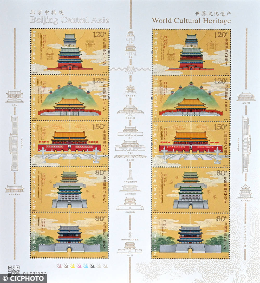 ↑2025年7月27日在中国邮政集团有限公司邯郸市分公司拍摄的《世界文化遗产——北京中轴线》特种邮票。CICPHOTO/郝群英 摄