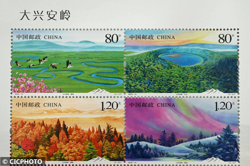 ↑2025年8月8日在中国邮政集团有限公司四川省内江市东兴区分公司拍摄的《大兴安岭》特种邮票。CICPHOTO/兰自涛 摄