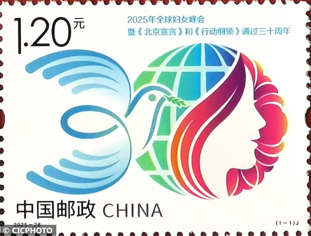 ↑2025年10月13日在广西贺州市拍摄的《2025年全球妇女峰会暨〈北京宣言〉和〈行动纲领〉通过三十周年》纪念邮票。CICPHOTO/廖祖平 摄