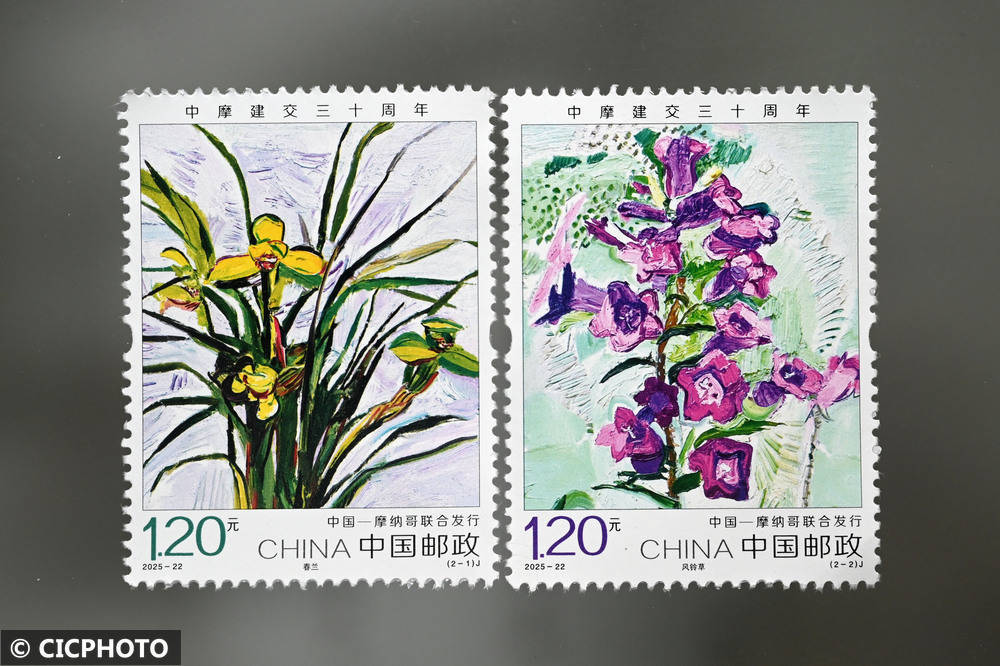 ↑2025年10月15日在中国邮政集团有限公司四川省内江市东兴区分公司拍摄的《中摩建交三十周年》纪念邮票。CICPHOTO/兰自涛 摄