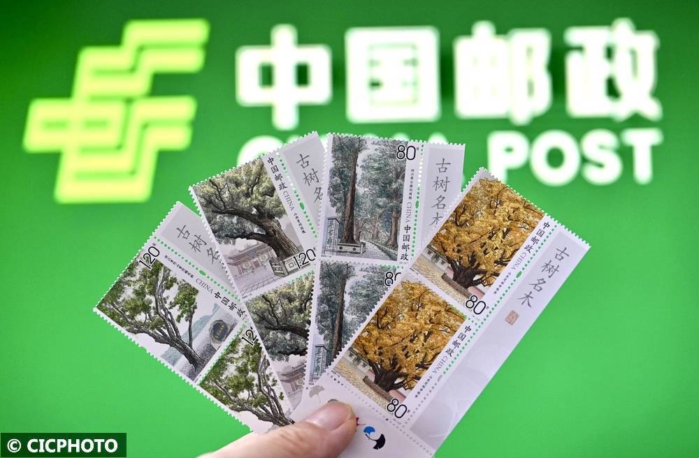 ↑2025年8月15日在中国邮政集团有限公司四川省内江市东兴区分公司拍摄的《古树名木》特种邮票。CICPHOTO/唐明润 摄
