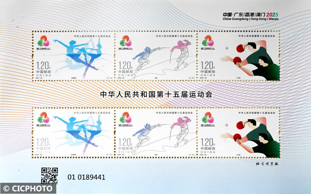 ↑2025年11月9日在中国邮政集团有限公司邯郸市分公司拍摄的《中华人民共和国第十五届运动会》纪念邮票。CICPHOTO/郝群英 摄
