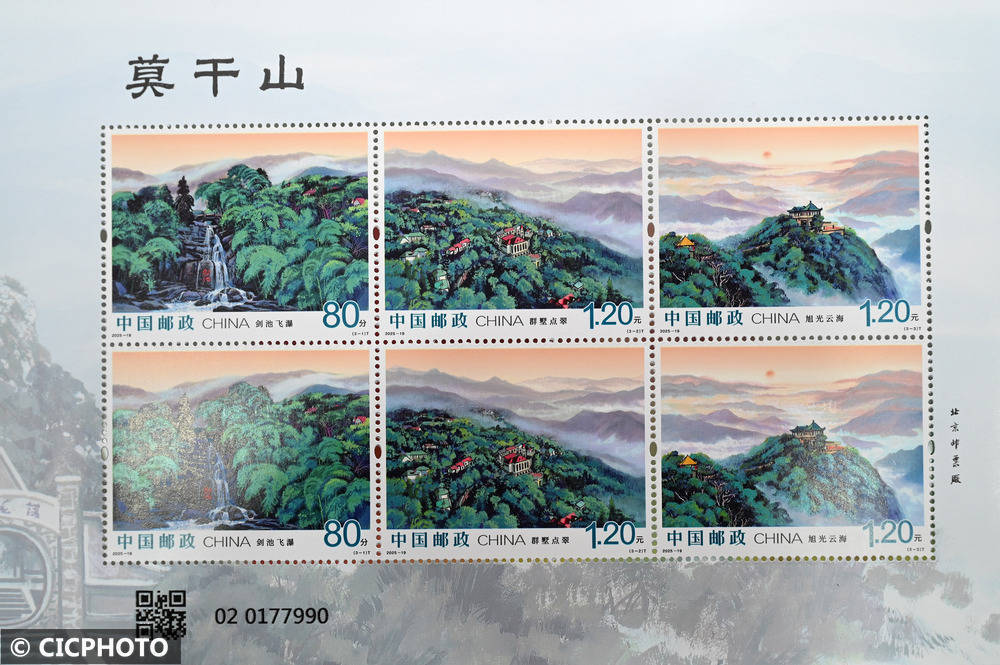 ↑2025年9月22日在中国邮政集团有限公司四川省内江市东兴区分公司拍摄的《莫干山》特种邮票。CICPHOTO/兰自涛 摄
