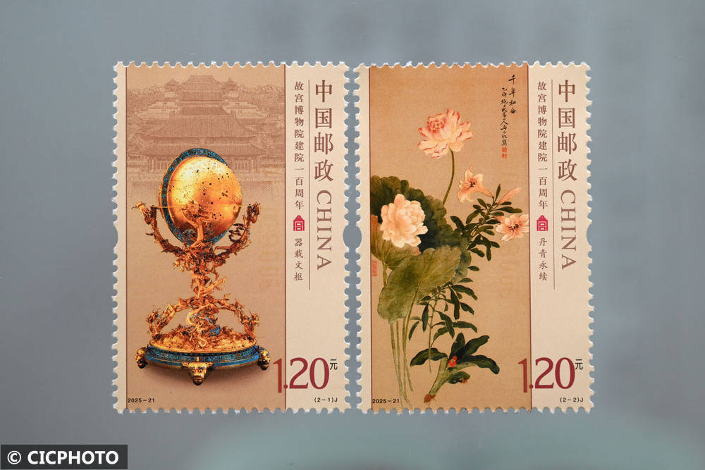 ↑2025年10月10日在中国邮政集团有限公司四川省内江市东兴区分公司拍摄的《故宫博物院建院一百周年》纪念邮票。CICPHOTO/兰自涛 摄