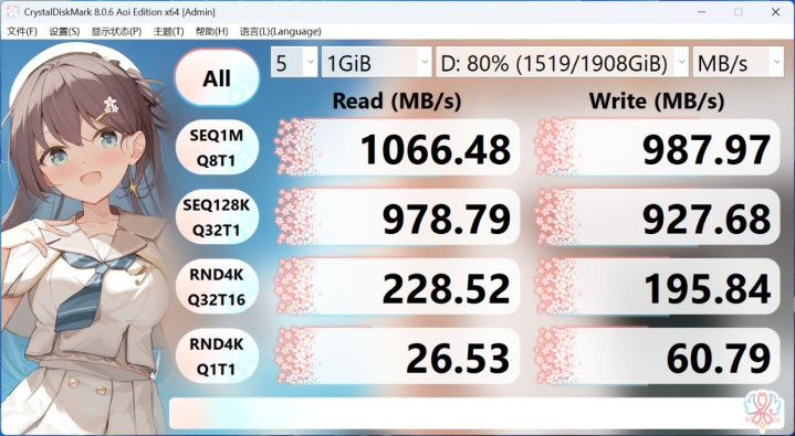 提高难度到剩余空间仅剩20%,金士顿DualPortable移动固态硬盘仍然表现出色,1066 MB/s的连续读速和987 MB/s的连续写速确保在存放了大量文件之后仍然有极高的响应性能。
