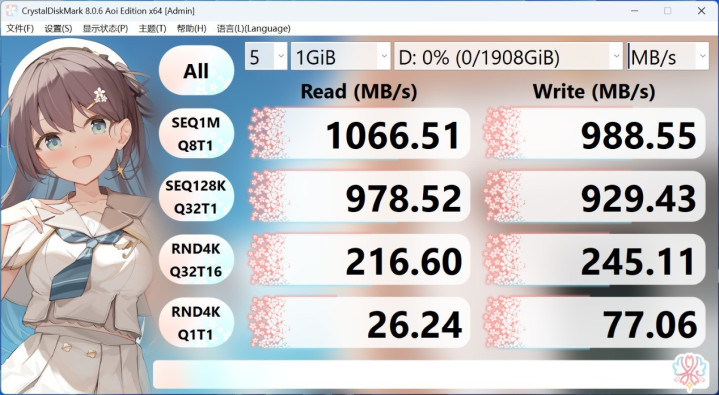 从CrystalDiskMark的测试结果来看,金士顿Dual Portable移动固态硬盘的连续读速达到1066 MB/s,连续写速则达到了988 MB/s,非常接近USB 3.2 Gen 2的理论带宽,可以说把这个接口的性能压榨干净了。