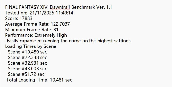接下来我们将其作为游戏盘进行读取测试,在《最终幻想XIV:晓月的终焉》测试中,总加载时长为10.481秒,对于共有5个场景的3A游戏来说显然是不错的成绩,也就是说,即使将其作为游戏盘直连电脑进行游戏,金士顿Dual Portable也能有非常流畅的加载速度。